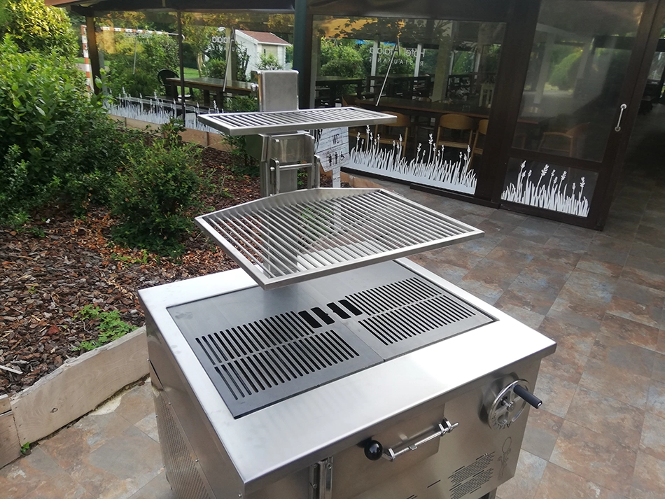 El sistema de elevación suave mediante reductora y las rejillas ajustables en altura facilitan cambios rápidos de intensidad, mientras que el recogebrasas integrado y la estructura reforzada con ladrillo refractario ayudan a conservar mejor el calor del carbón y a reducir consumos.