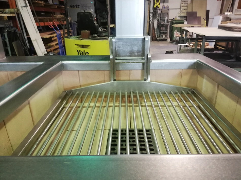 Incorpora un sistema de elevación suave mediante reductora, rejillas ajustables en altura, sistema recogebrasas y estructura reforzada con ladrillo refractario para conservar mejor el calor del carbón y optimizar el consumo.