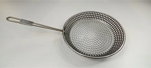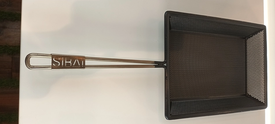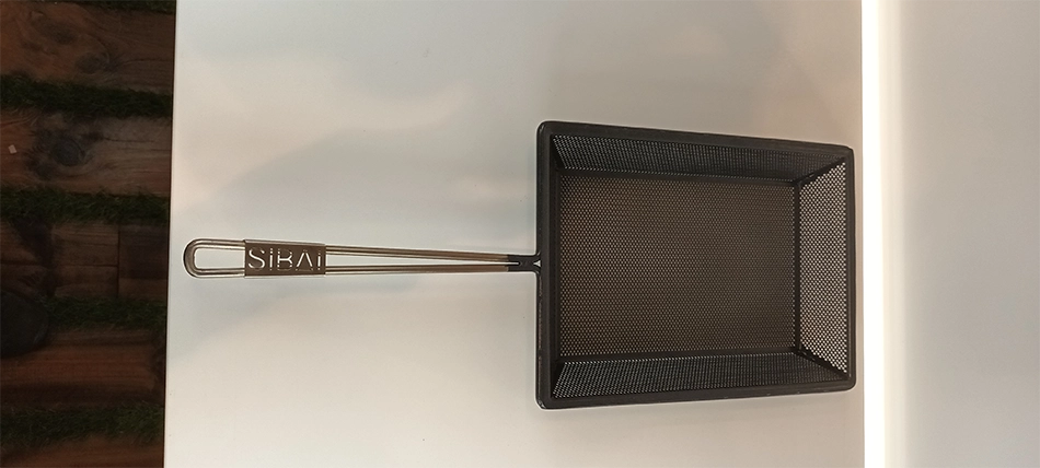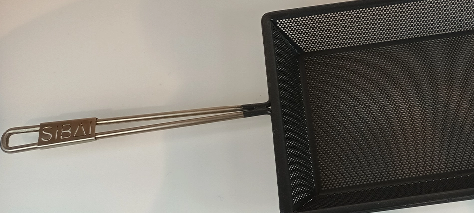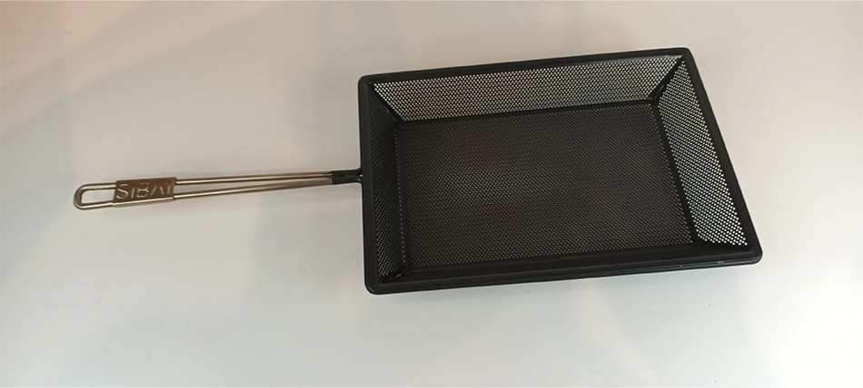 Pensada para ingredientes delicados como angulas o huevos a la brasa, esta sartén rectangular incorpora una malla más tupida y un recubrimiento antiadherente que garantiza una cocción uniforme y segura sin que el producto se adhiera.